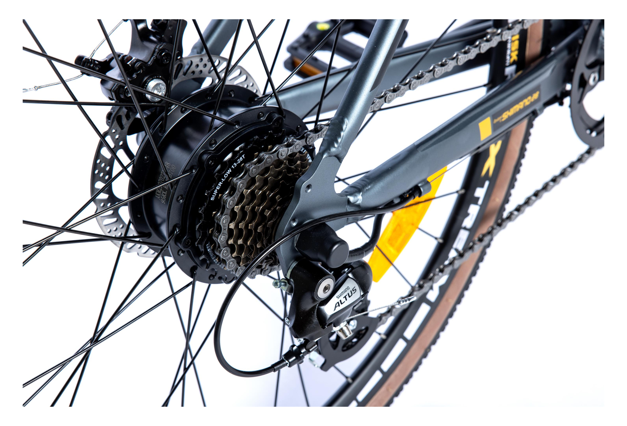 TRANSMISSION SHIMANO: Tous nos produits sont équipés par SHIMANO, dans ce cas un Dérailleur SHIMANO ALTUS RD-M310, 8 vitesses (grand pignon 13 T / petit pignon 28T), et manette avec poussoir.