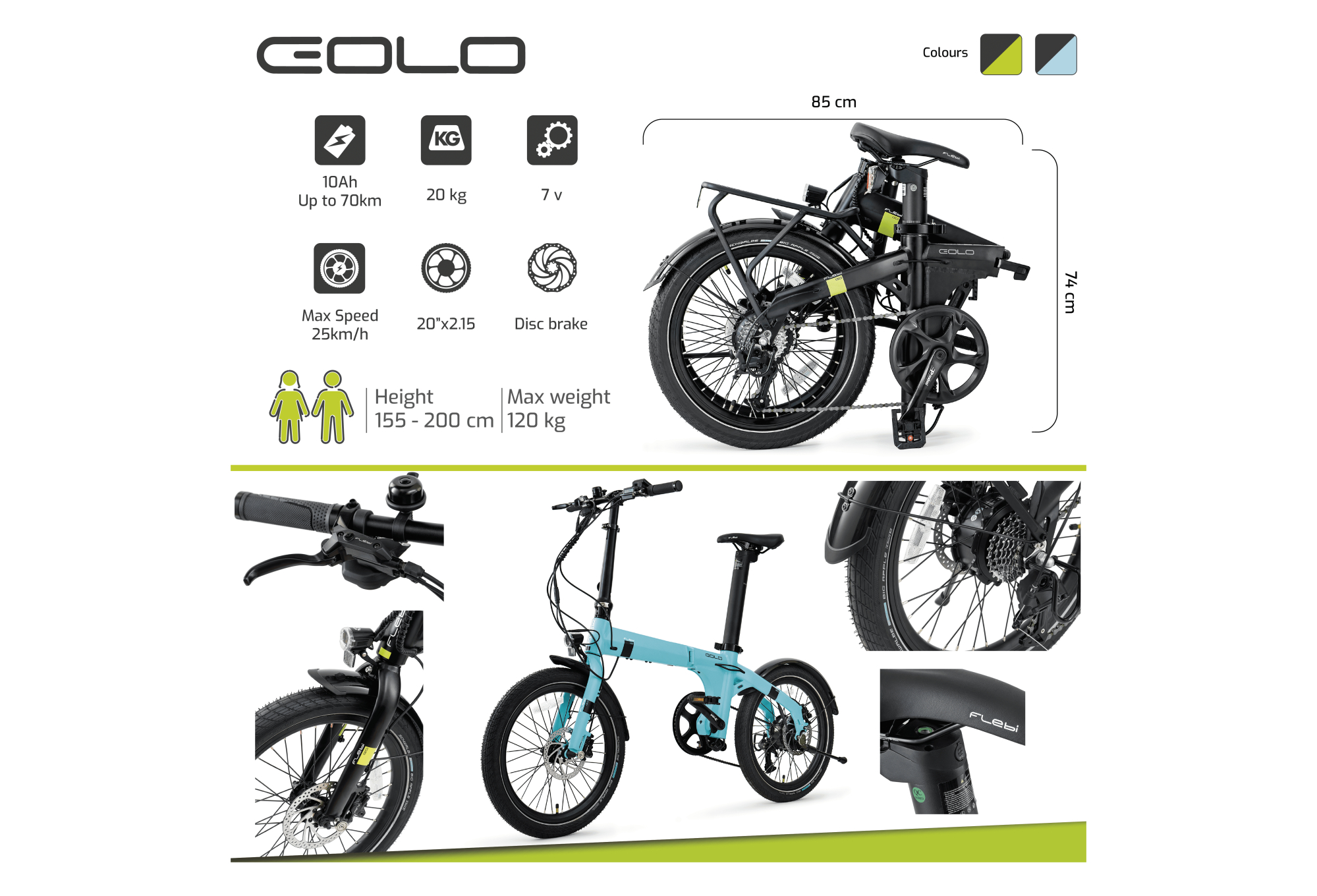 L’Eolo est le vélo électrique idéal pour le cycliste urbain d’aujourd’hui. Pliant Flebi Eolo Bleu ciel a un design élégant et est pratique et polyvalent. Profitez d’une expérience de conduite unique